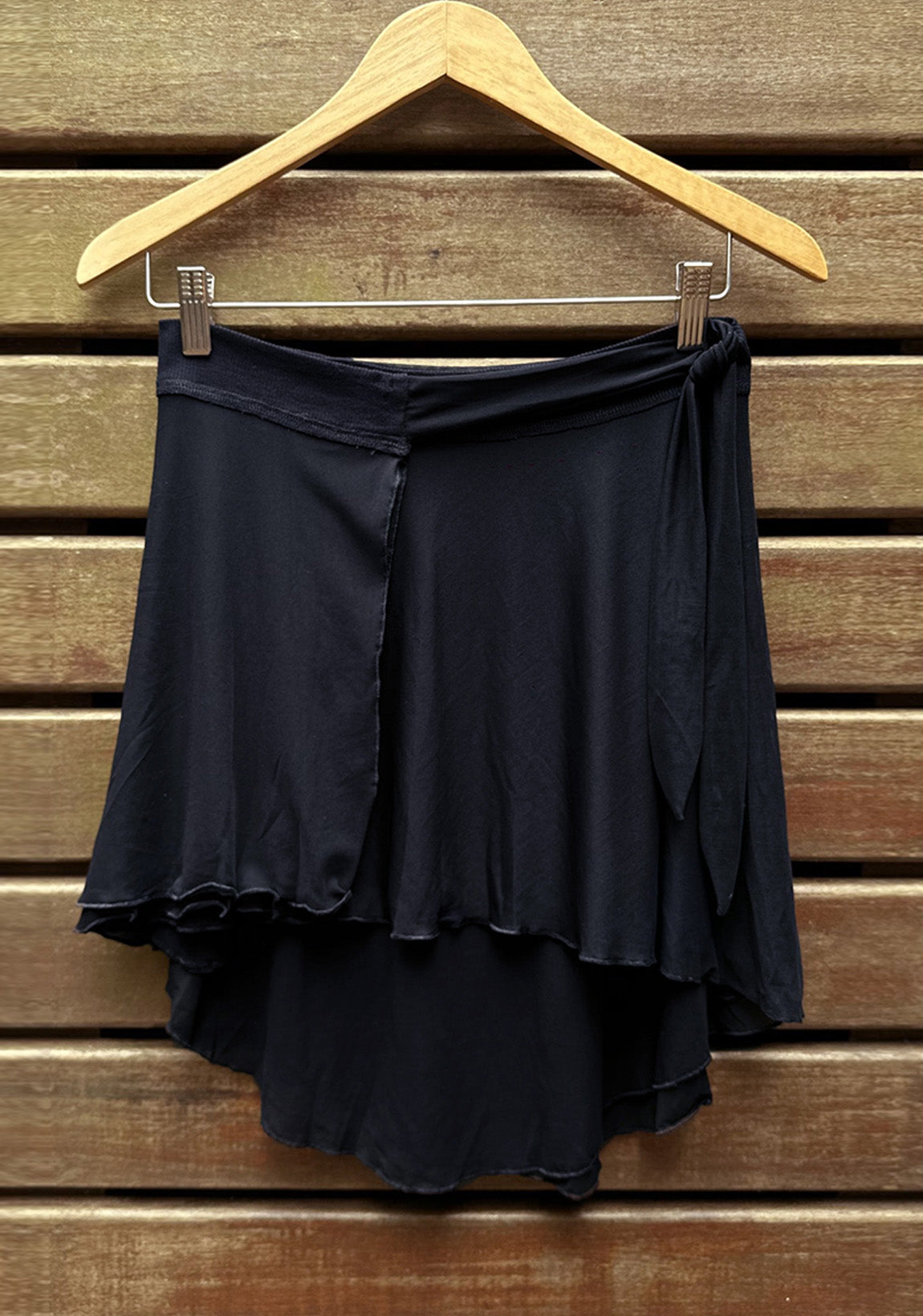 Saia em Tule, dupla para dar menos transparência d com comprimento irregular. Mais curta na frente e mais longa nas costas. Fechamento por transpasse e amarração. Pode ser amarrada para ficar mais comprida nas costas ou amarrar na lateral para ficar assimétrica ao lado. Cós em Rib de Viscose com elastano.